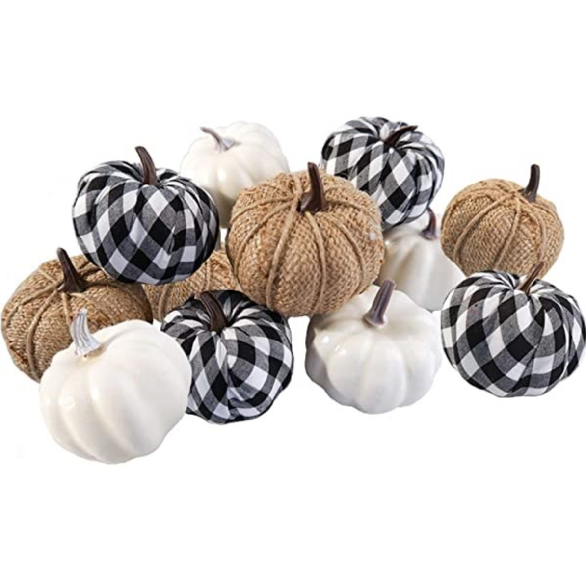 Assorted pumpkins in burlap and plaid. 3 colours.