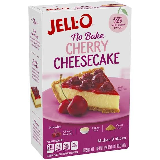 Jell-O No Bake Cherry Cheesecake Dessert Mix allows you to make a yummy no bake cheesecake in 15 minutes without even turning on your oven. Each package contains cherry topping, cheesecake filling mix and graham cracker crust mix for more of the taste you love. Simply add milk, butter and sugar to create a delicious, classic cherry cheesecake in minutes with no oven needed! Perfect for holiday gatherings, parties, picnics or just as a regular treat, this cheesecake is the perfect no bake dessert. This festive dessert is sure to please your friends and family with its smooth, velvety texture and rich, creamy flavor. Each enclosed package of ingredients is individually sealed.