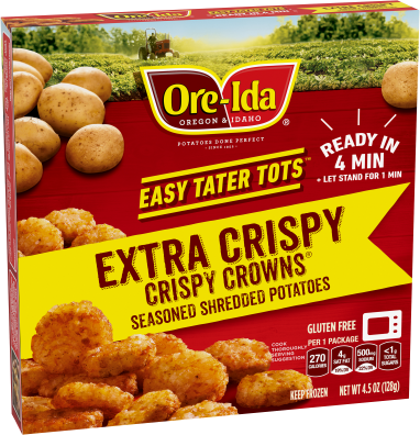 These specially prepared Ore-Ida Crispy Crowns!(r) are coin shaped Tater Tots(r) potatoes that cook to crispy perfection using the heat from your microwave. Now you can enjoy crispy and delicious Tater Tots(r) in less than 4 minutes with Ore-Ida(r) Easy Tater Tots(r)(em)Crispy Crowns!(r) ; Enjoy anytime! Breakfast, lunch, dinner or snack.